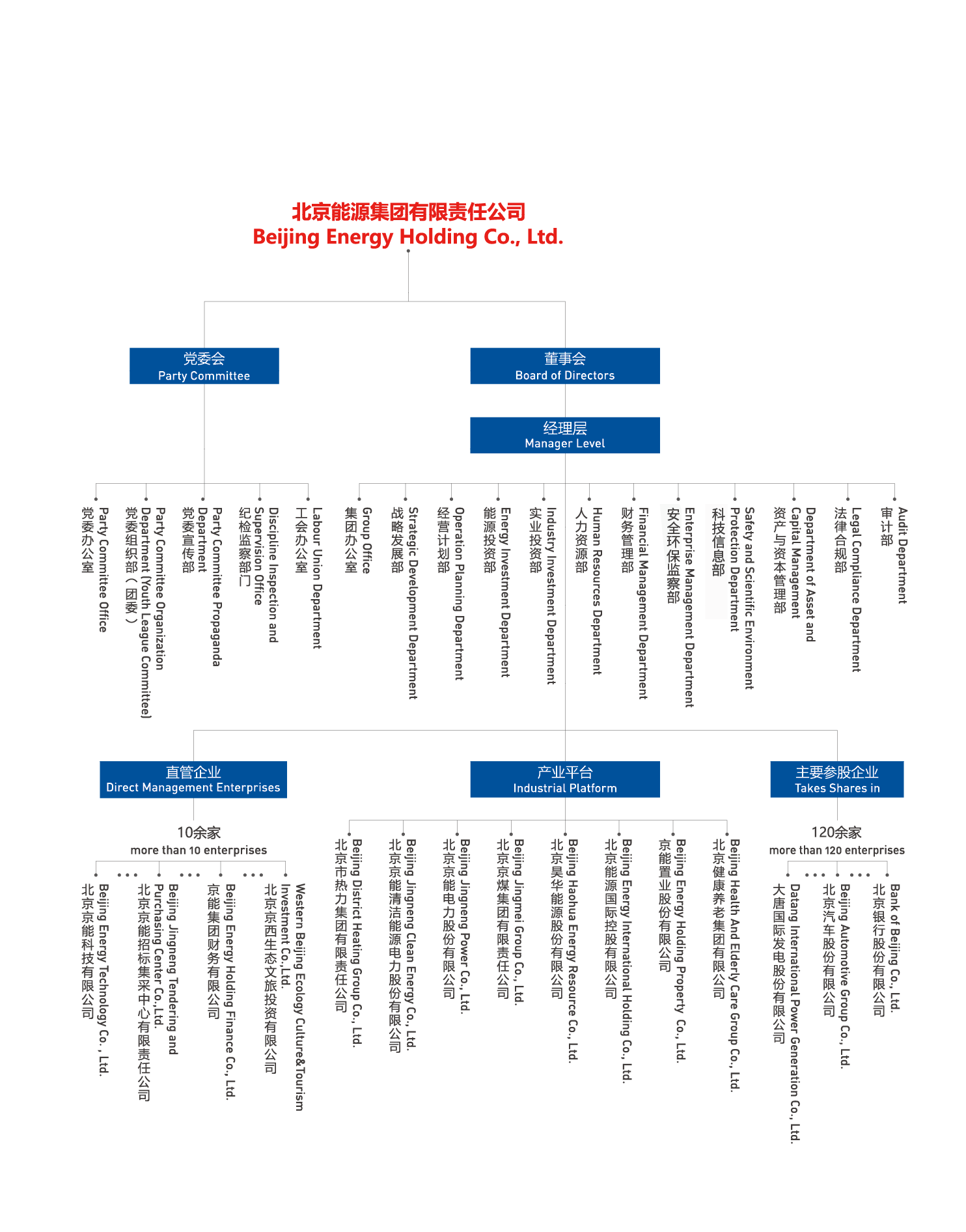 北京能源集團(tuán)有限責(zé)任公司(以下簡(jiǎn)稱(chēng)“京能集團(tuán)”或“集團(tuán)”)是北京市人民政府出資設(shè)立的國(guó)有獨(dú)資公司,肩負(fù)著保障首都北京能源安全可靠供應(yīng)的重任。集團(tuán)成立于2004年,由原北京國(guó)際電力開(kāi)發(fā)投資公司和原北京市綜合投資公司合并而成,2011年、2014年先后又與北京市熱力集團(tuán)有限責(zé)任公司、北京京煤集團(tuán)有限責(zé)任公司實(shí)施合并重組,實(shí)現(xiàn)了產(chǎn)業(yè)鏈條融合互補(bǔ)。經(jīng)過(guò)多年的資源整合,集團(tuán)由單一能源產(chǎn)業(yè)發(fā)展為熱力、電力、煤炭、健康文旅等多業(yè)態(tài)產(chǎn)業(yè)格局。2024年底,集團(tuán)資產(chǎn)規(guī)模達(dá)4934億元,年?duì)I業(yè)收入975億元,全資及控股企業(yè)860余家,參股企業(yè)120余家,擁有員工3.4萬(wàn)余人,投資區(qū)域遍布全國(guó)33個(gè)省市區(qū)以及海外,控股京能清潔能源、京能電力、昊華能源、京能置業(yè)、北京能源國(guó)際、京能熱力六家上市公司,盈利水平長(zhǎng)期穩(wěn)居北京市屬企業(yè)前列。2024年在中國(guó)企業(yè)500強(qiáng)排名第247位,中國(guó)服務(wù)企業(yè)500強(qiáng)排名第87位。